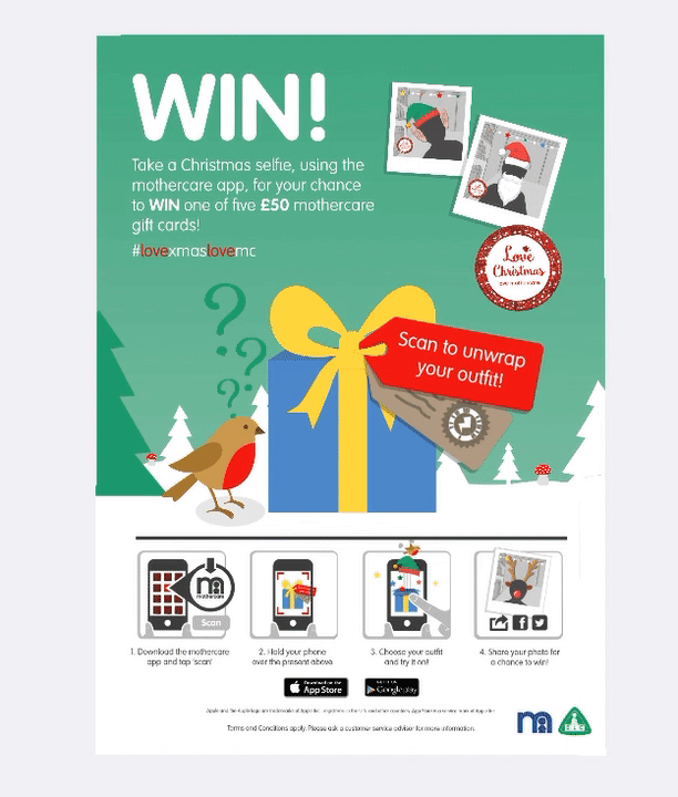 For Mothercare's 2015 #lovexmaslovemc campaign, they launched an in-store AR poster in their shops which encouraged their customers to scan to win a £50 Mothercare gift card. In order to do this their customers shared pictures online of themselves wearing Christmas themed attire with the hashtag #lovexmaslovemc